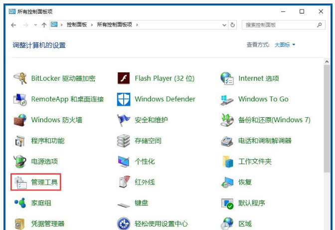 1、进入控制面版,找到管理工具;