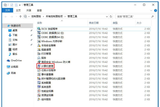 2、打开管理工具,找到计算机管理;