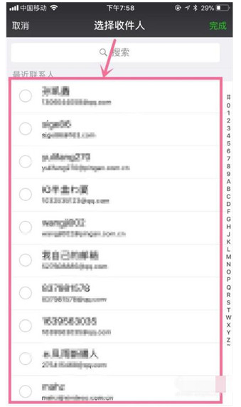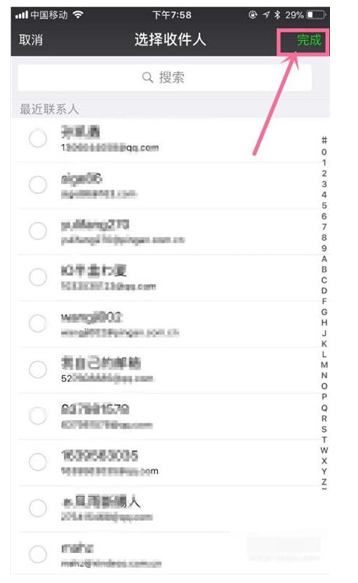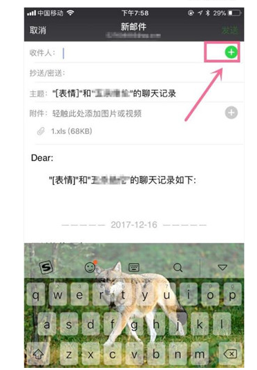 6、然后点击收件人,你可以键入收件人,或者是点击屏幕右侧的+号,选择收件人,如下图所示。