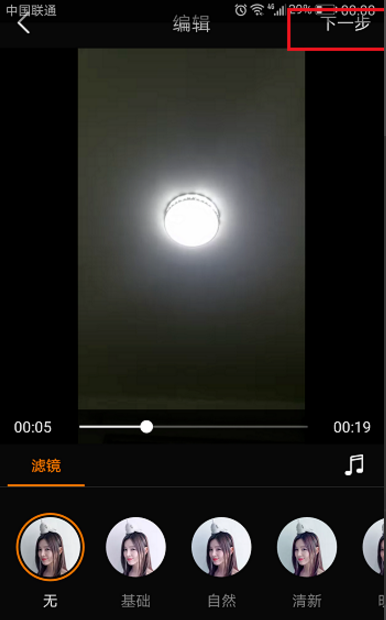 4、视频拍摄完成之后,进去视频编辑界面,默认点击下一步,如下图所示:
