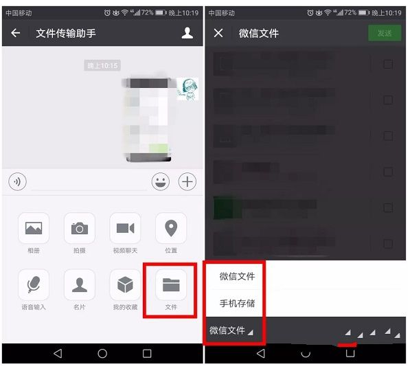 点击“+”,选择“文件”,可以发送微信文件或手机存储的文件