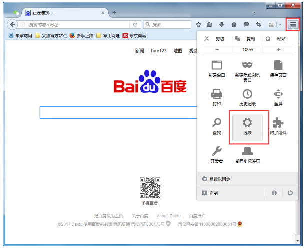 1、首先我们打开火狐浏览器,然后在其右上角的菜单中打开“选项”功能;
