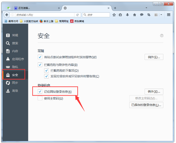 2、接着在选项里打开“安全”界面,然后取消勾选“记住网站登录信息”就可以了;