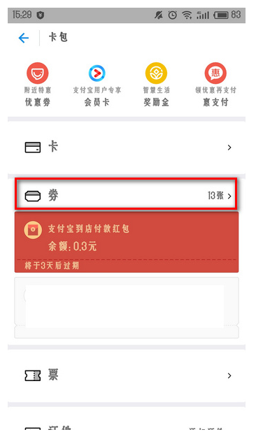 3、你会在券中看到你在支付宝刮卡中获得的福利,
