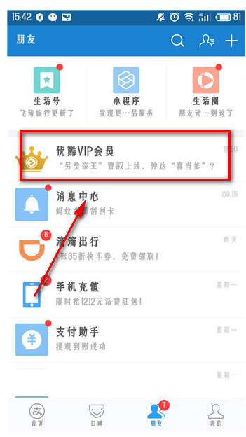 点击进入支付宝中的“朋友”页面,有的网友优酷VIP会员,可以直接点击进入,