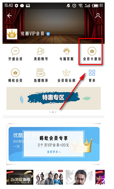 进入优酷VIP会员生活号后点击会员卡激活,即可使用,