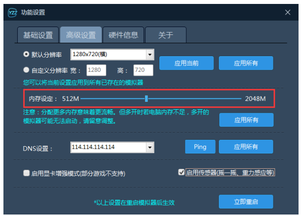 (2)然后在“高级设置”界面找到“内存设定”,在这里将内存调大一些(根据电脑配置进行调整),调整完毕后重启模拟器即可。