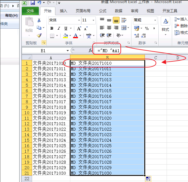 2、在名称右侧单元格内填写 =“MD ”&A1然后向下拖动,这是生成DOS命令行的,意思就是建立名称为XX的文件夹,