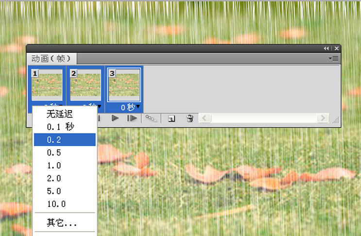 9、选择动画面板中的这三帧,点击延迟将延迟时间设置为0.2s,点击播放按钮进行测试效果。