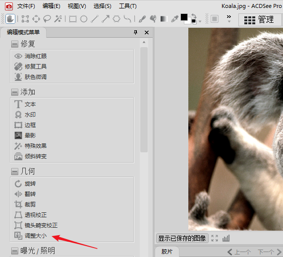 2、在acdsee看图软件的编辑中有很多实用的功能,堪比最强大的photoshop了,我们在左侧的“几何”选项中选择“调整大小”。