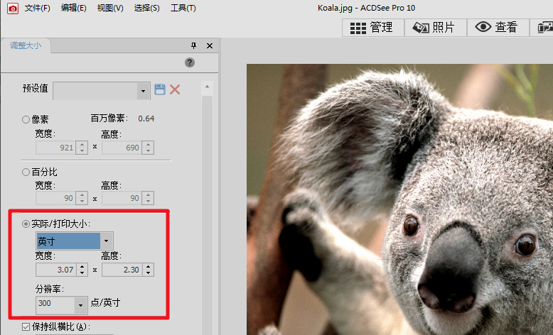 5、如果我们需要使用acdsee改图片分辨率,我们选择实际/打印大小,在里面就可以改图片的分辨率了,同时还可以改宽和高。