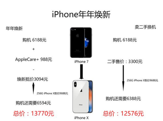 从图上可以看到,初步计算来看,同样从iPhone 7更换到256GB的iPhone X,直接卖二手价格能够少花一千多元。对于用手机比较爱惜,不轻易磕碰,更没有摔碎情况的朋友来说,购买AppleCare+只为了年年焕新计划是不划算的。