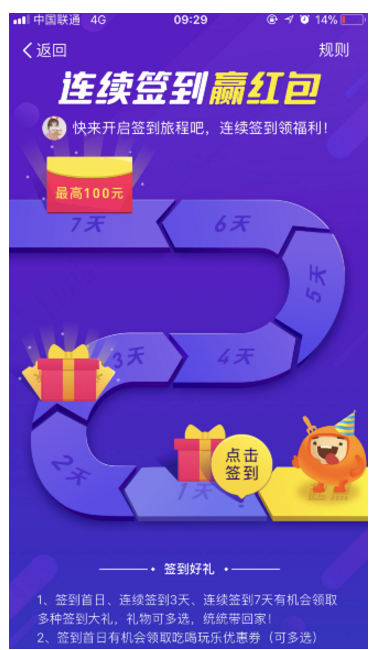 2、点击进入即可参与签到活动,若是没有签到图标可切换城市(例如上海、北京、广东等),不仅每天签到有好礼,累计达到3、7天还能获得累积奖励哟,最高可领取100元。