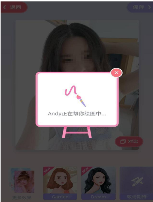打开美图APP,绘画机器人早已在首页等着我。我赶紧戳进了新功能,然后很随机(心机)地选择了一张自拍照,按下了绘画按钮。当页面出现“Andy正在帮你绘图中”的字样时,我心跳加速。