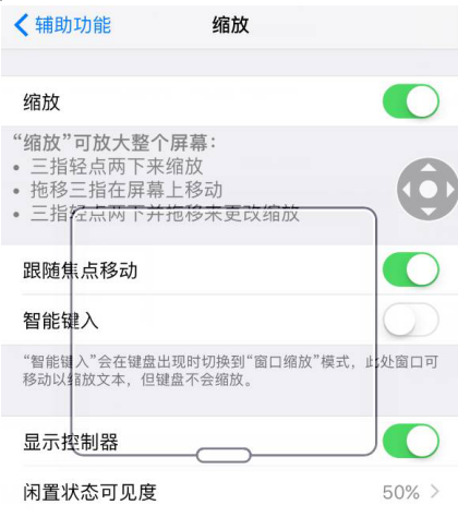 5、退出缩放,在辅助功能界面的最下方找到辅助功能快捷键,点击进入,并选择“缩放”这个选项,其他所有选中的选项都要取消。