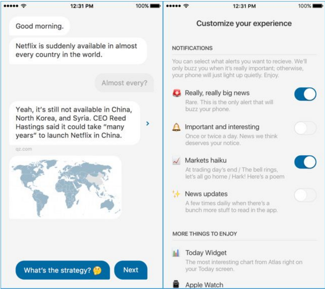 Quartz是一款英语新闻阅读应用,以会话的方式推送新闻,交互方式非常新颖。有时它也推送图片、GIF、或链接,还有Emoji和动态的表情包,就像和朋友聊天一样,让阅读变得有趣。