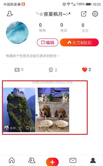 1、在手机上打开火山小视频软件,进入我的界面,点击右边的心图标,如下图所示: