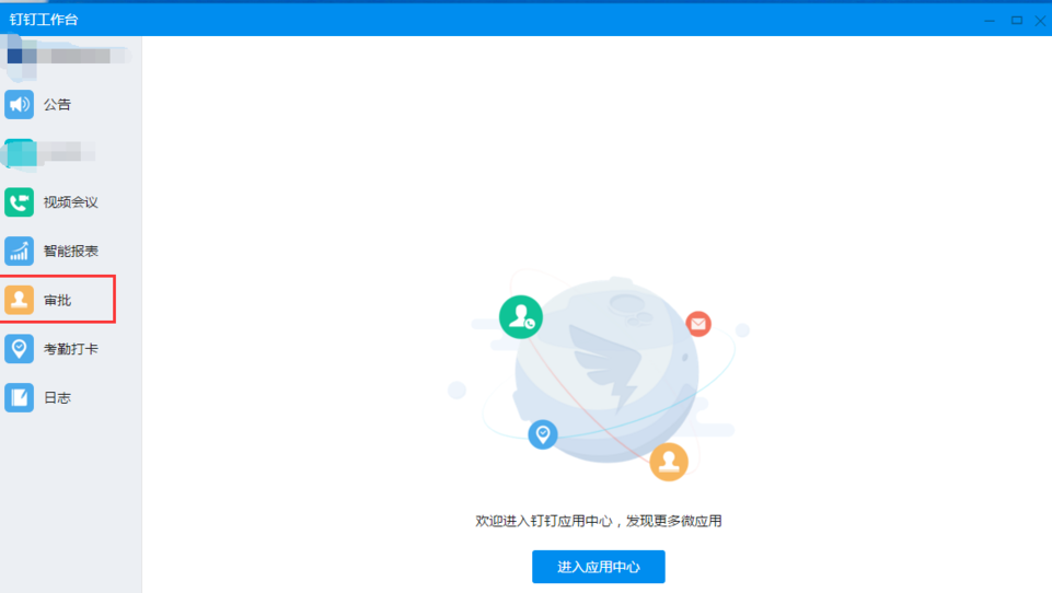 2、打开钉钉工作台之后,点击左侧“审批”。
