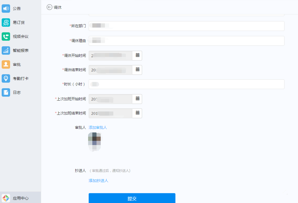 5、输入完成后,添加审批人(一般是你的直管领导),下面可添加抄送人,可抄送给你做考勤的人或者有工作上在你调休期间有业务往来的同时等。点击“提交”。