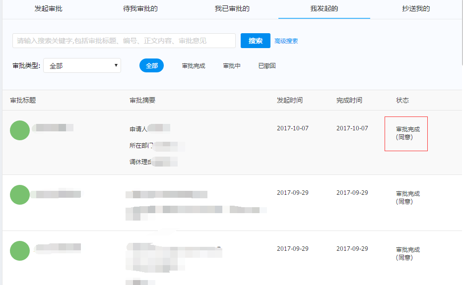 7、审批通过后,再次打开就可看到审批完成(同意),这样你的调休申请就完成了。