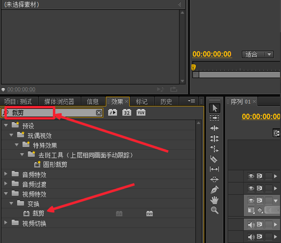 3、这里有一个搜索框,在这里搜索一个“裁剪”特效,如图,搜索到了。