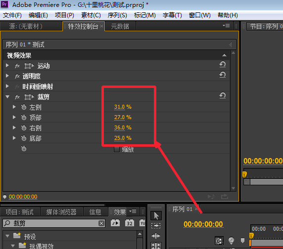 5、在左上角找到“特效控制台”,设置参数就可以裁剪画面了。