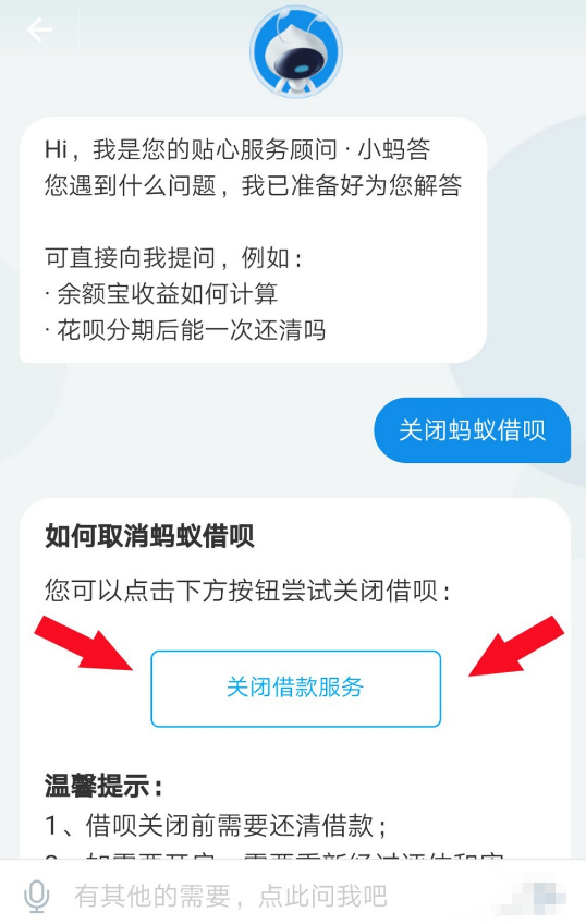 3、在页面下方的输入框内输入“关闭蚂蚁借呗”,点击发送。