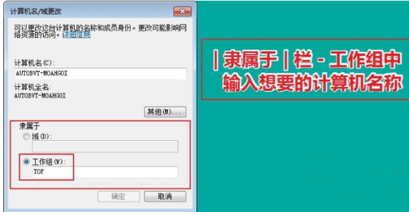 在“计算机名/域”对话框的“隶属于”栏中,输入想要的计算机名称,