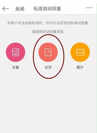 6、图中会显示自动回复文章、文字、图片三中类型,此处我们点击“文字”,其他类型的回复操作类似。