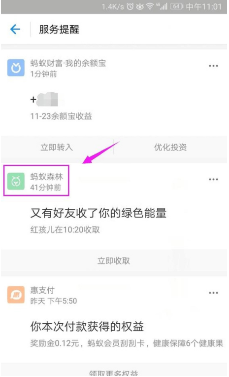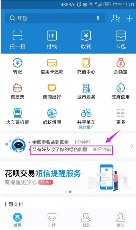 1、打开手机支付宝,进入页面,我们可以看到提示说“又有好友收取了你的能量”,点击那里,如图所示,