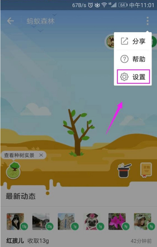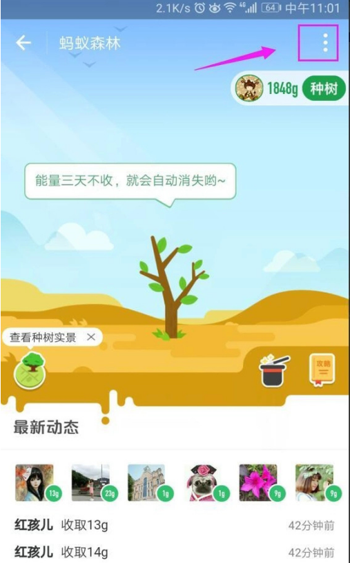 3、来到了蚂蚁森林界面,我们点击右上方的3个白点,如图所示。