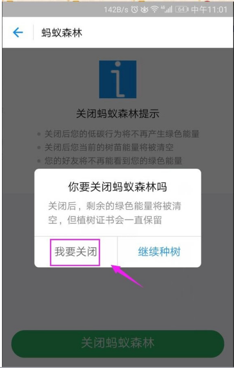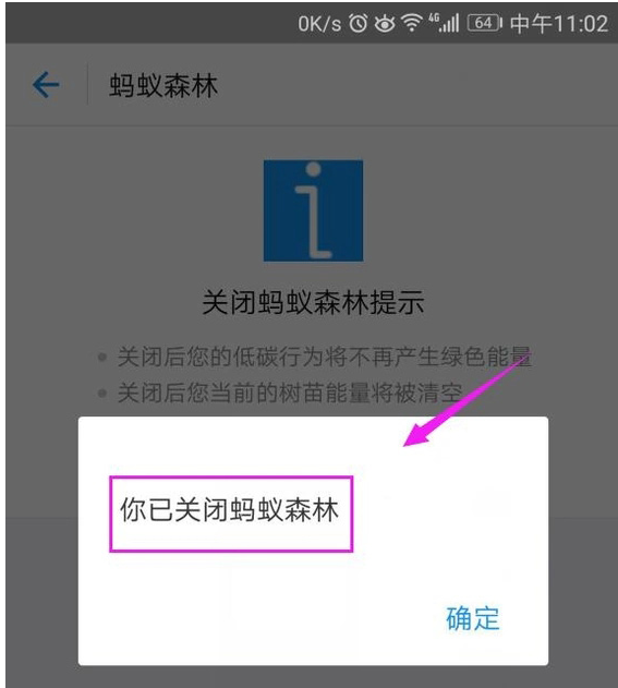 7、然后就可以看到“你已关闭蚂蚁森林”的提醒,如图所示。