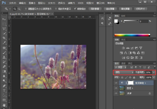 4、做了渐变之后,我们将该图层的模式调整为【滤色】,设置其不透明度为35%;