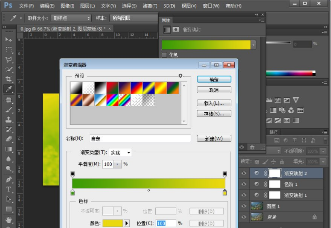 3、然后我们新建一层【渐变映射】调节图层,在渐变映射图层上做一个紫色到黄色的渐变,如图所示: