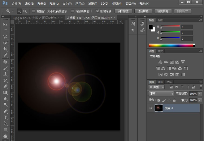 9、在刚才新建的文档中填充颜色为黑色,接着依次点击菜单栏中的滤镜》》渲染》》镜头光晕,具体设置数值如图: