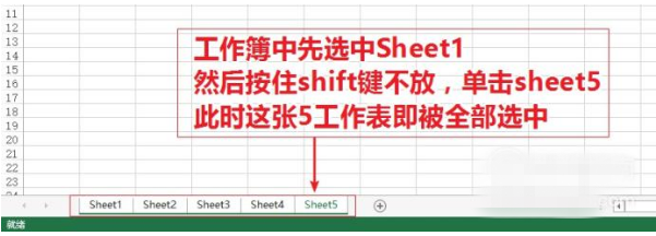 工作簿中选中Sheet1,然后按住shift键不放,单击sheet5。此时5张工作表即被全部选中。
