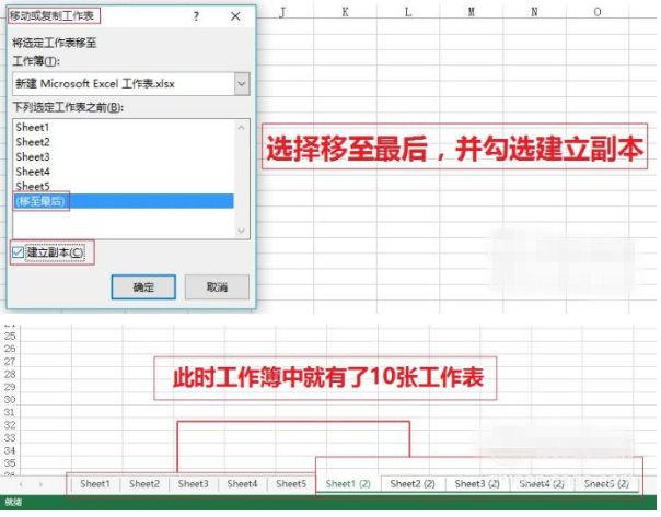 对话框中选择移至最后,并勾选建立副本,此时工作簿中就有了10张工作表。