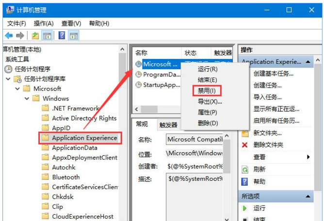 5、在左侧定位到:计算机管理\\系统工具\\任务计划程序\\任务计划程序库\\Microsoft\\Windows\\Application Experience,在右侧找到 Microsoft Compatibility Appraiser选项,将其禁用即可。