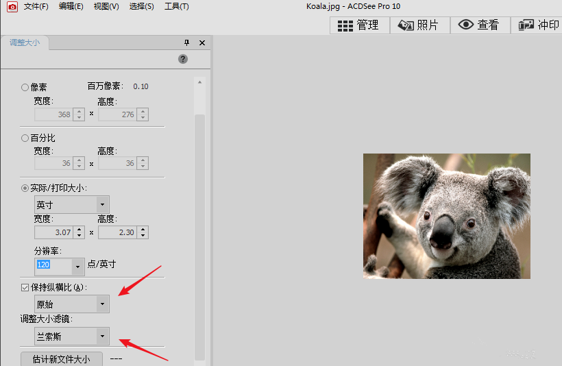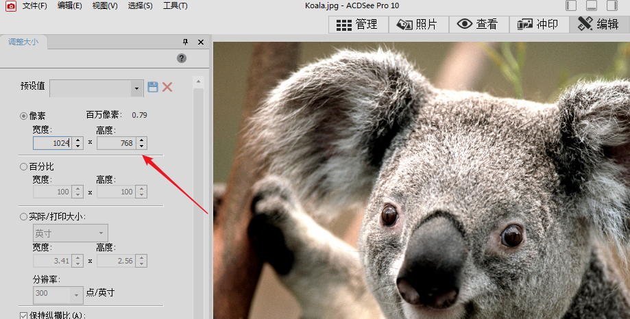 5、如果我们需要使用acdsee改图片分辨率我们选择实际/打印大小,在里面就可以改图片的分辨率了,同时还可以改宽和高。