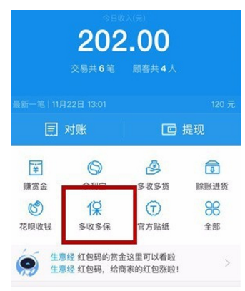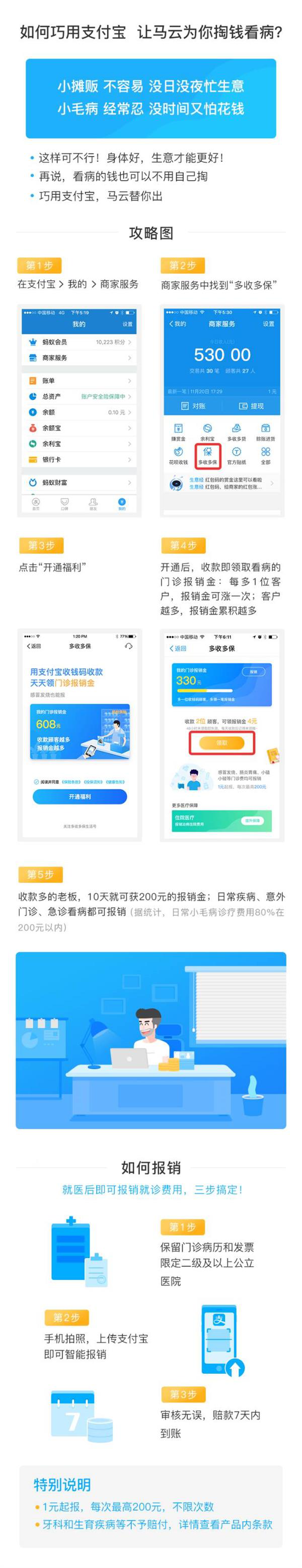 用户参加支付宝多收多保活动后,可以免费领取10元的门诊报销金。以后每多1位顾客向我们的收钱码付款,我们就可以领取1笔2元的门诊报销金,顾客越多,领取的报销金就越多。同一顾客在当天只能为我们提供一笔报销金。