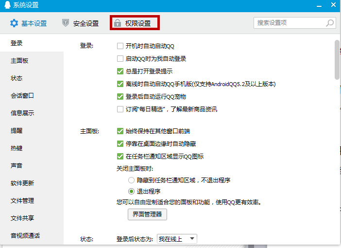 3、点击设置按钮,来到系统设置页面,点击“权限设置”,