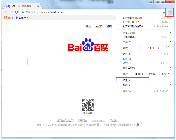 1、首先打开谷歌浏览器,然后在其右上角的菜单中打开“设置”功能;