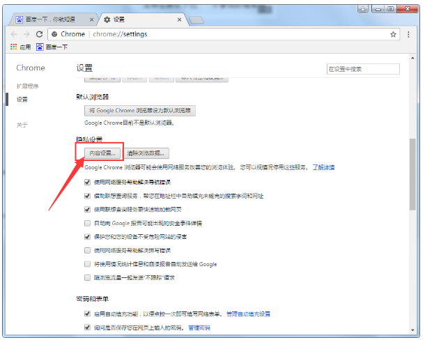 3、在高级设置中找到“隐私设置”分类,然后打开它的“内容设置”功能;