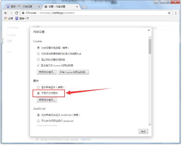 4、接着在内容设置的“图片”分类中勾选上“不显示任何图片”就可以开启无图模式了。