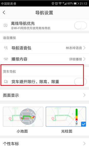 4、在导航设置里面找到货车导航,导航会避开限高、限行、限重,如下图所示: