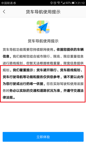 5、点击进去之后,会有货车导航提示,点击“立即体验”,如下图所示: