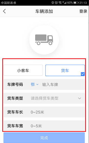 6、在“车辆添加”界面,将货车的类型、长宽输入,点击完成就设置好了货车导航,如下图所示: