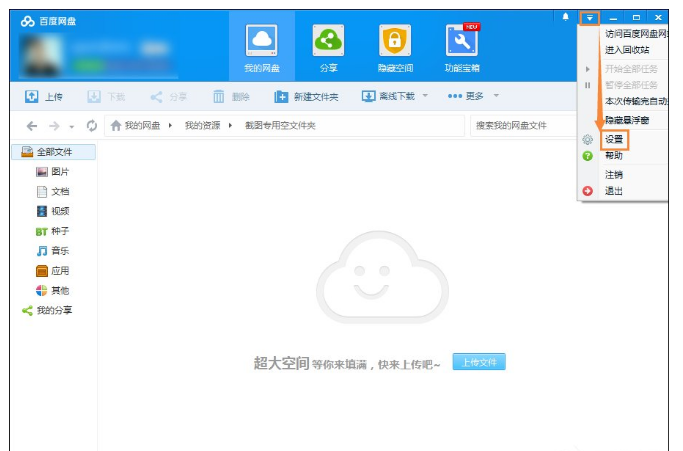 1、打开百度网盘,登录账号,点击右上角设置按键,在弹出的菜单中选择“设置”。
