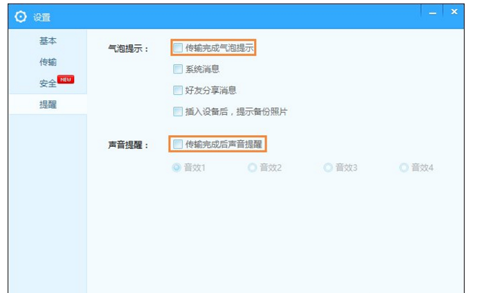 3、在提醒右侧有一项“声音提醒”在,将“传输完成后声音提醒”勾选取消,最后点击确定即可。