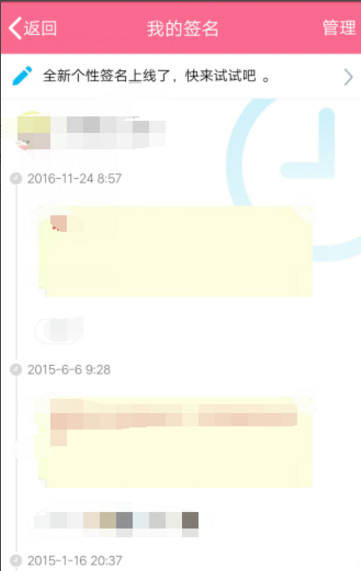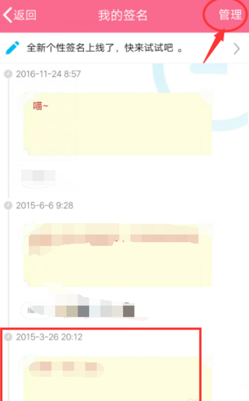 3、这时我们看到有很多不同时间的签名,那就是历史签名,如果我们要删掉2015-3-26 20:12的签名,点击右上角的“管理”。